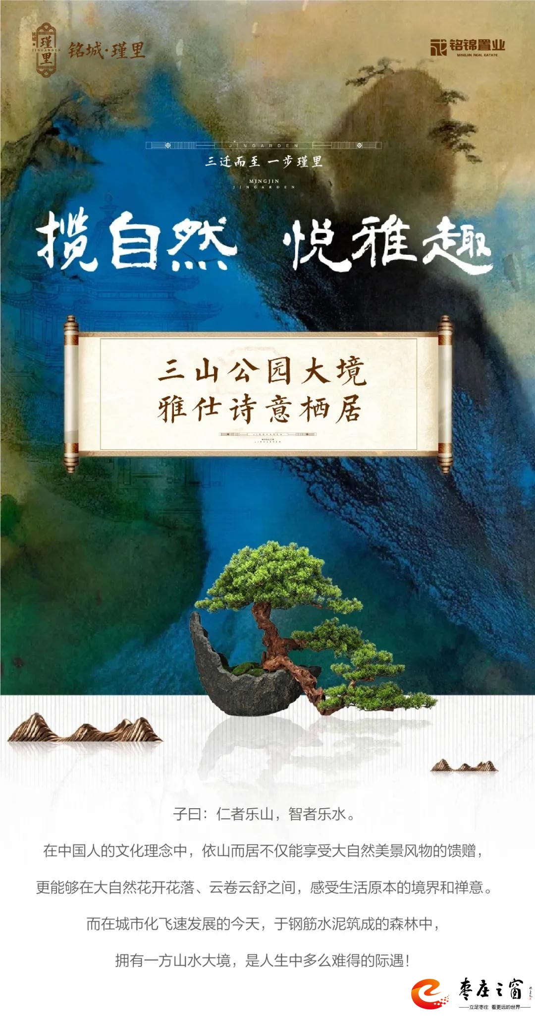 在山水之間,尋求生活的初心;在自然生態(tài)中,摒棄生活的雜念。三山環(huán)抱,締造大美意境,新仕族生活更添雅致樂趣。銘城瑾里,于山水間筑造人文雅居;濃蔭秘境里,看云卷云舒,花開花落;在愜意悠然中享受最自然詩意的美好時光。