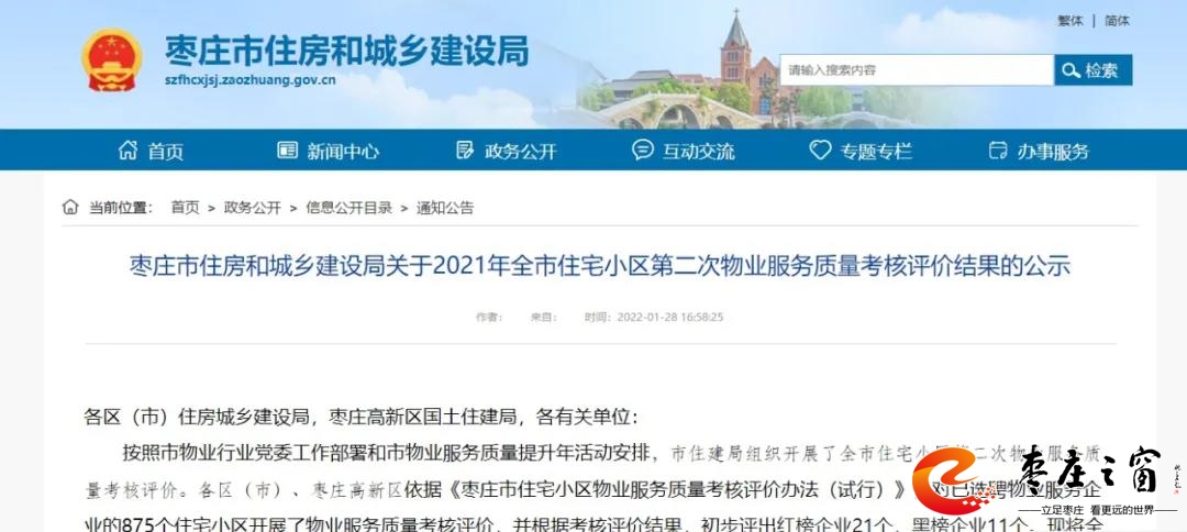 近日棗莊市住房和城鄉(xiāng)建設局發(fā)布《關于2021年全市住宅小區(qū)第二次物業(yè)服務質(zhì)量考核評價結果的公示》